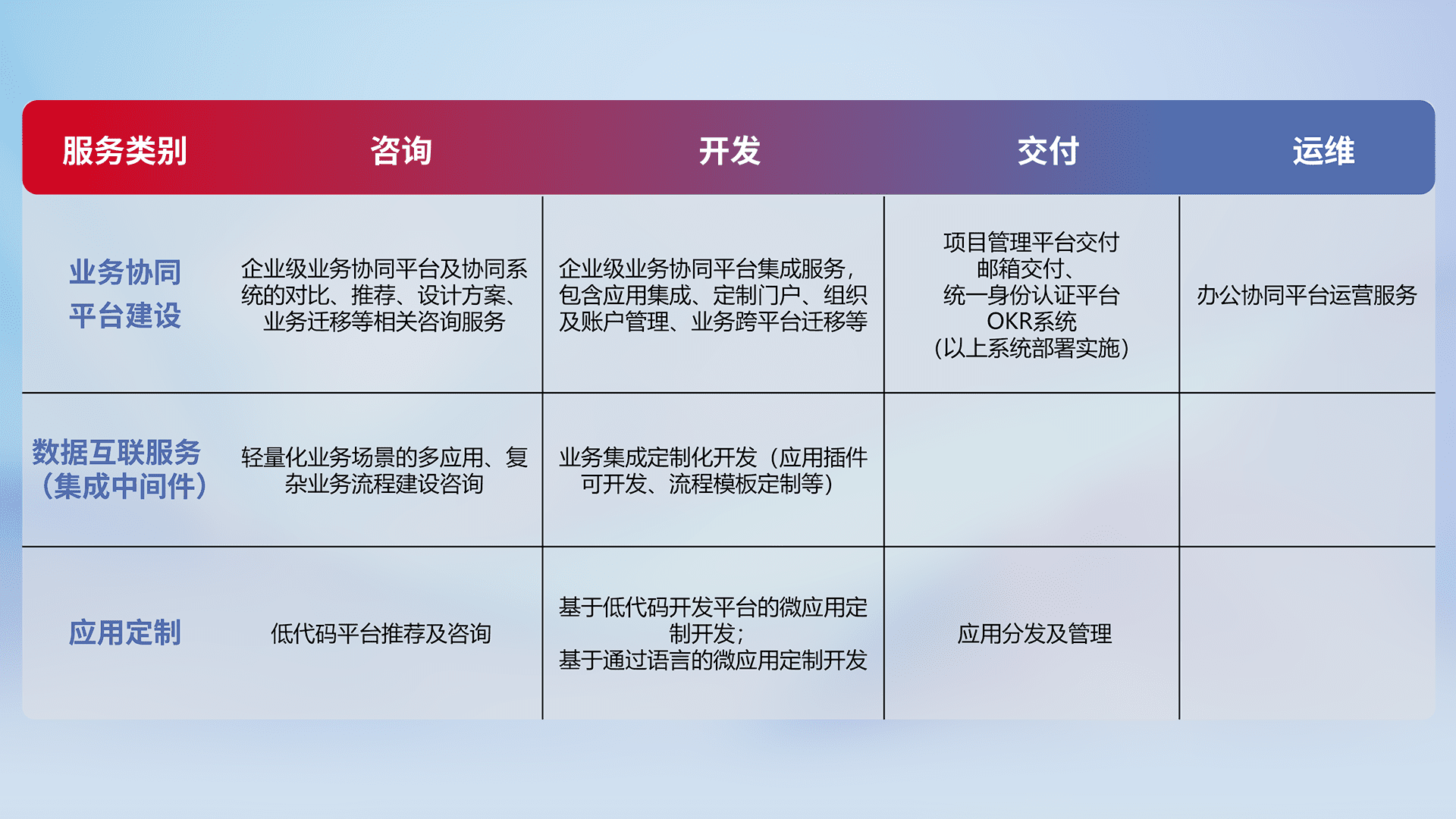 针对钉钉、、、、企微、、IDaas等平台级产品提供产品的规划、、、方案、、、交付、、、定制化开发等服务,,实现如统一协同办公、、、智能客户服务、、混合会议管理、、智能数据查询、、、等业务场景,,实现数字化转型。。。。